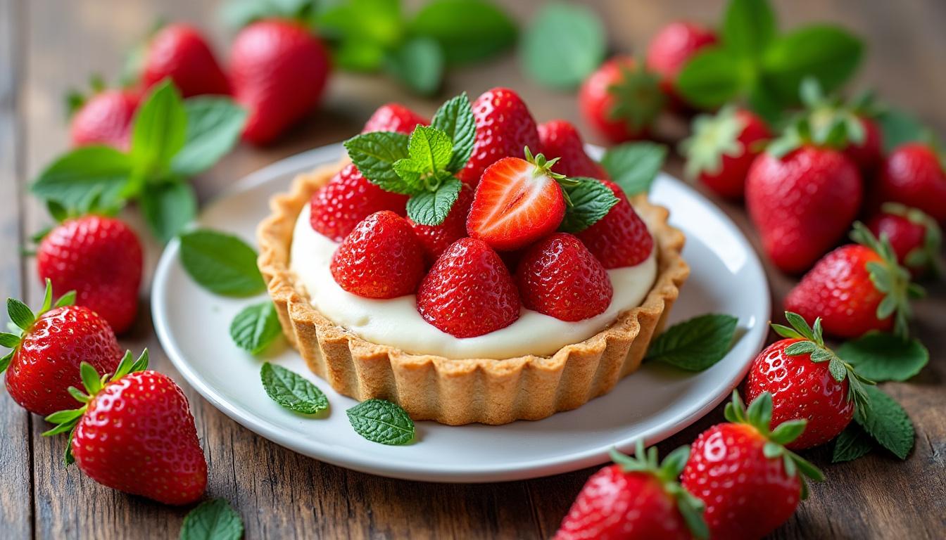 Une fois la crème légère étalée sur la croûte refroidie, disposer les fraises avec soin contribue à l’élégance visuelle du dessert. Pour magnifier cet équilibre, quelques feuilles de menthe fraîche apportent une touche de couleur et une pointe aromatique subtile. La tarte doit reposer au réfrigérateur au minimum une heure pour que la crème prenne bien et garantit une découpe nette et un service optimal.